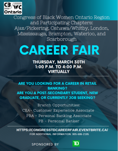 Congress of Black Women Ontario Region, in partnership with TD, invite you to understand the steps for a career in the banking industry! Join us for an information session and learn how you too can become a dynamic member of the TD team. College and University students, young graduates and anyone looking for a job in banking…come on out!