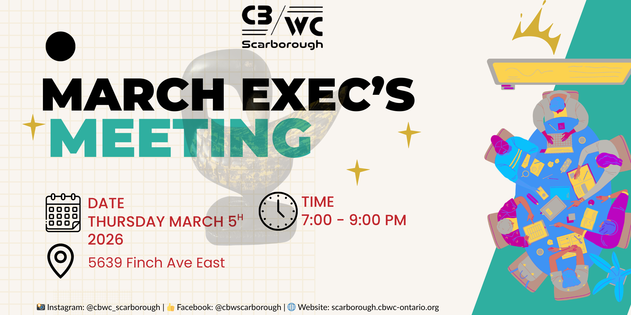 Monthly Exec Meetings + Add to Google Calendar + iCal / Outlook export 00 days 00 hours 00 minutes 00 seconds Date May 07 2026 Time 7:00 pm - 9:00 pm Location TAIBU CHC (Finch) 5639 Finch Ave East, Scarborough, ON Location 2 TIABU Community Health Centre 27 Tapscott Rd unit 1, Scarborough, ON M1B 4Y7 Share this event